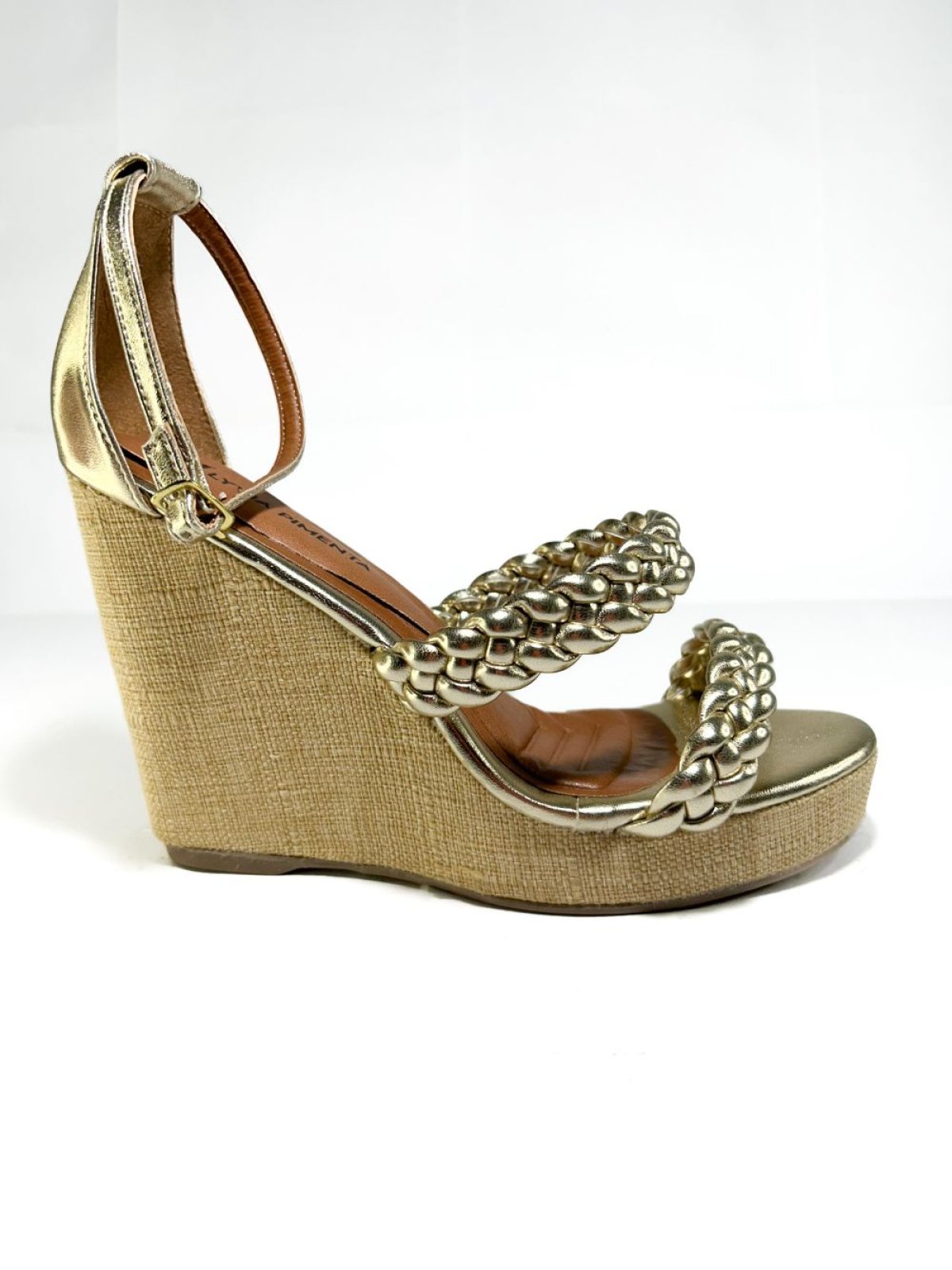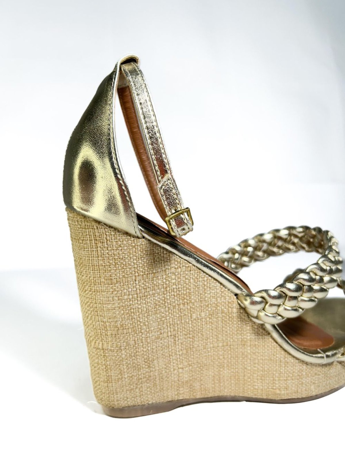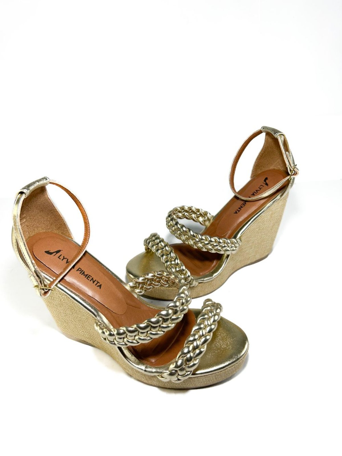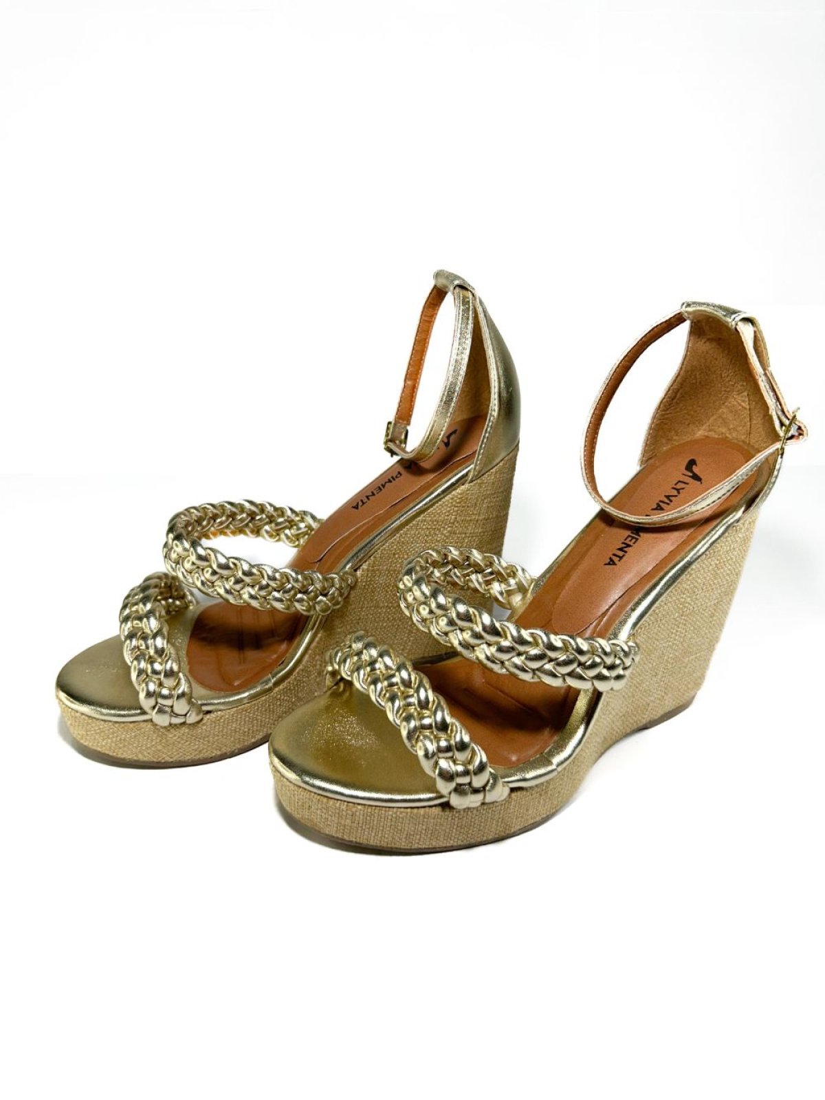 Ana Bela Tiras Trançadas - Dourada: Confeccionada em napa metalizado, a Ana Bela apresenta um design elegante com tiras trançadas que oferecem um toque sofisticado. Com um salto de 10 cm e 2 cm na parte da frente, proporciona uma altura equilibrada e confortável. O solado em material TR garante durabilidade e segurança ao caminhar. Ideal para complementar looks de festa ou ocasiões especiais, esse modelo é uma escolha perfeita para quem deseja brilhar.